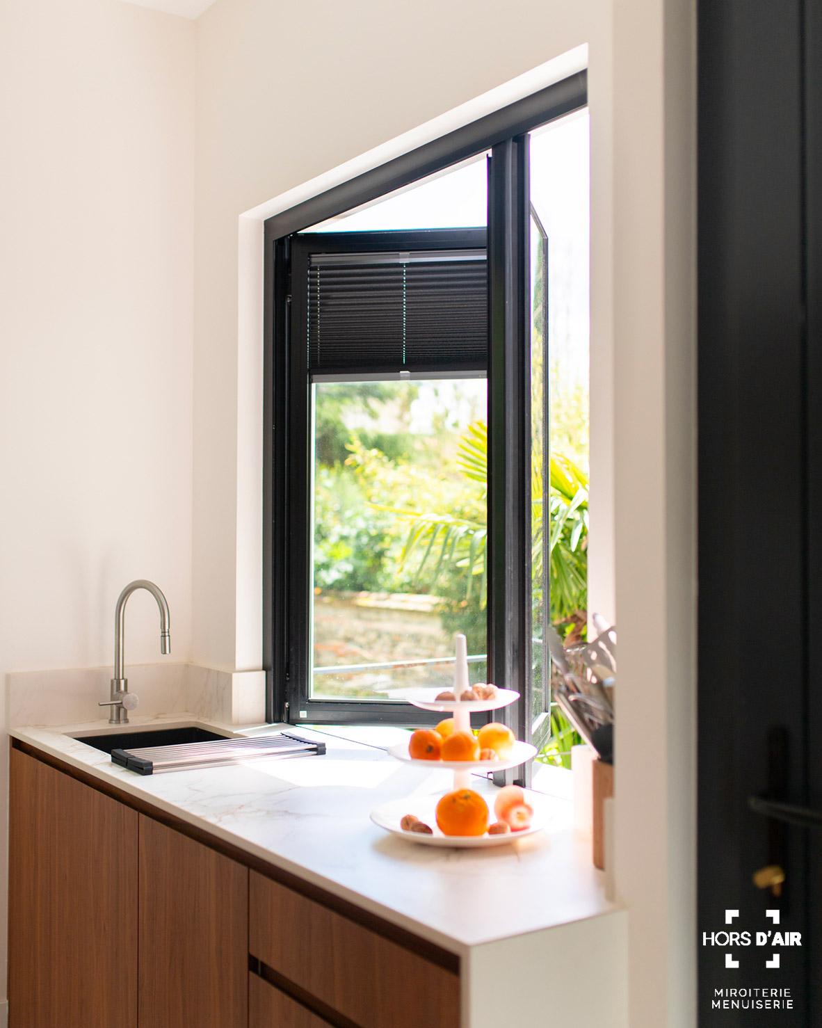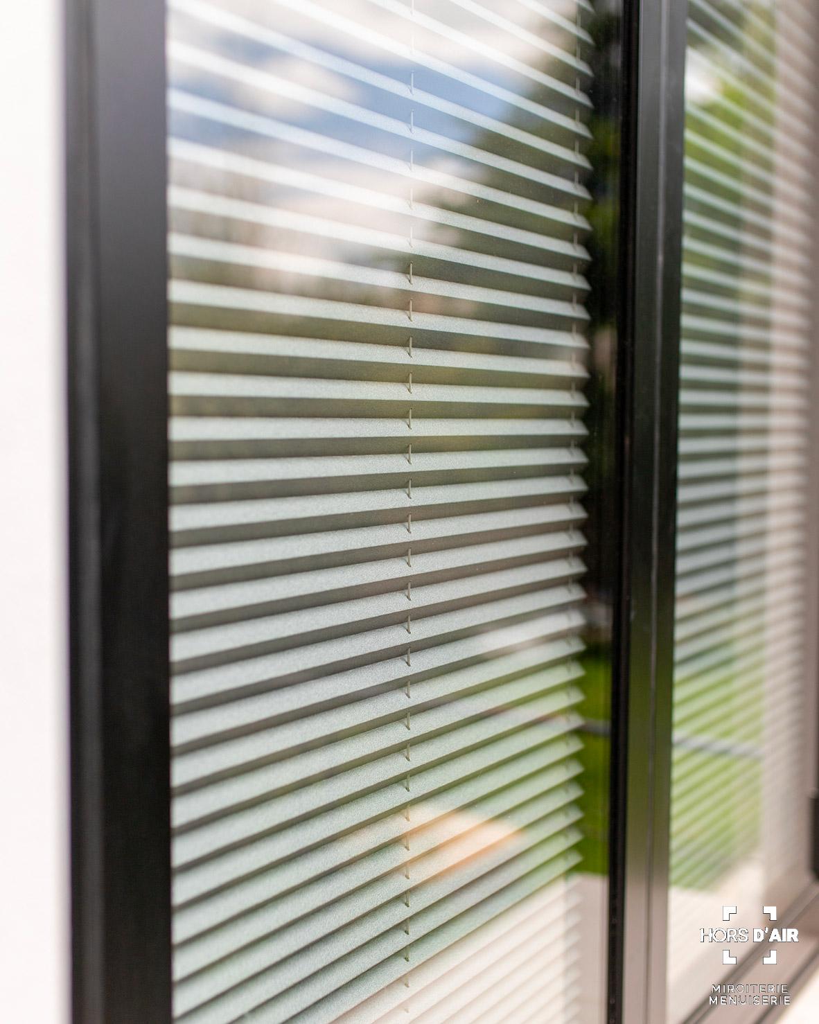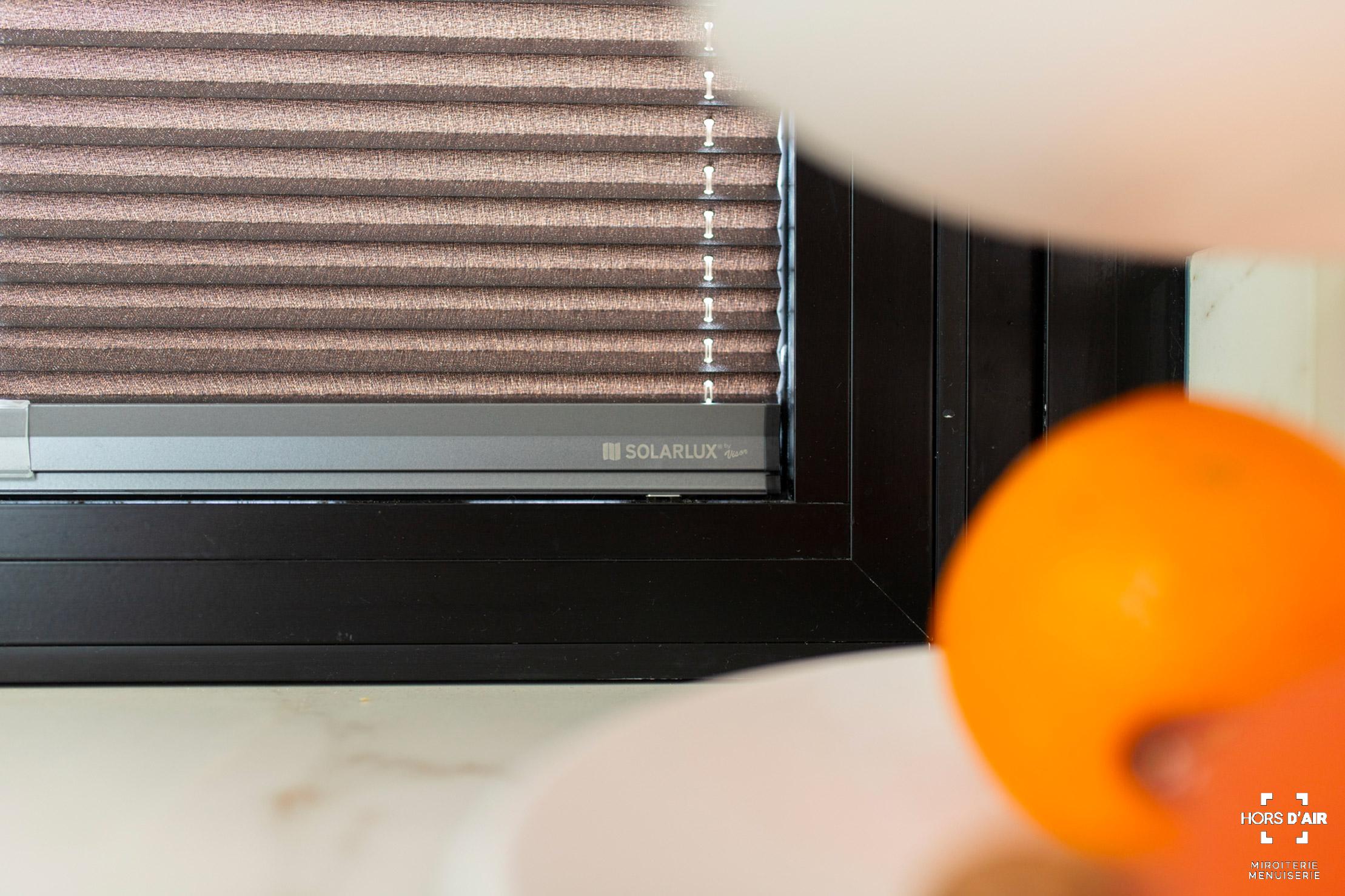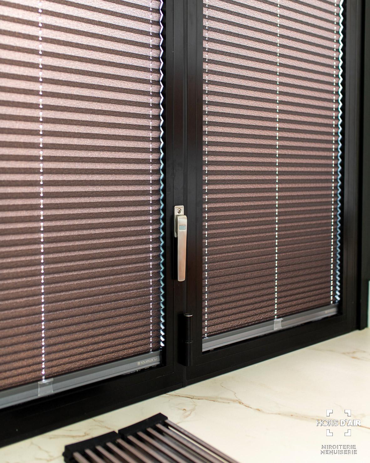 Le projet intègre également des stores plissés incorporés directement dans l’ouvrant Solarlux, permettant de préserver l’intimité et de maîtriser les apports lumineux tout en conservant une esthétique parfaitement minimaliste, sans ajout extérieur visible.