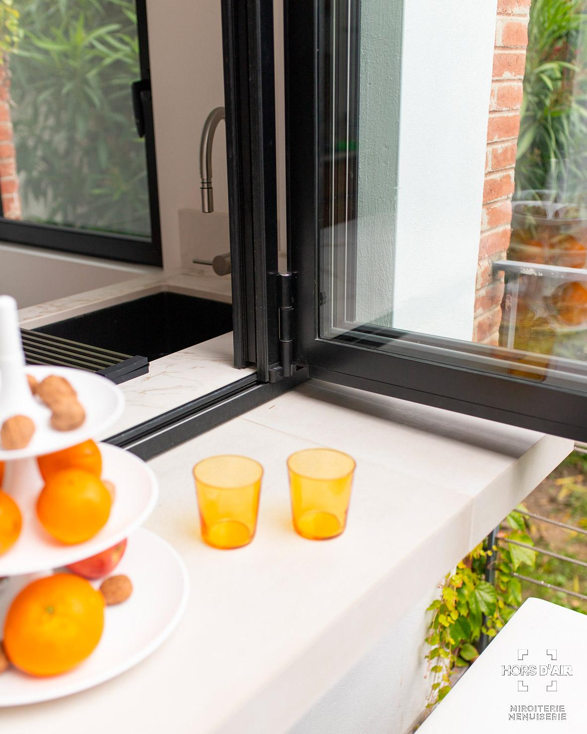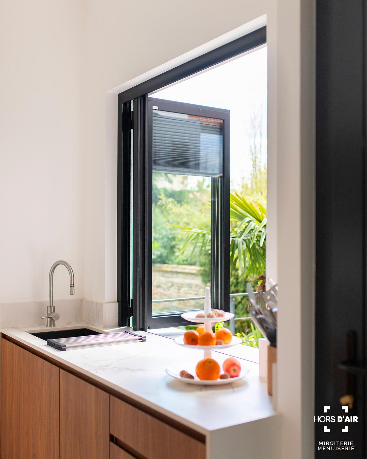 Le projet repose sur l’intégration d’une baie accordéon Solarlux, installée au-dessus d’un plan de travail intérieur, créant une ouverture panoramique totale vers la terrasse. Le système à vantaux repliables latéralement permet une disparition quasi complète des ouvrants, libérant le passage et optimisant l’espace.